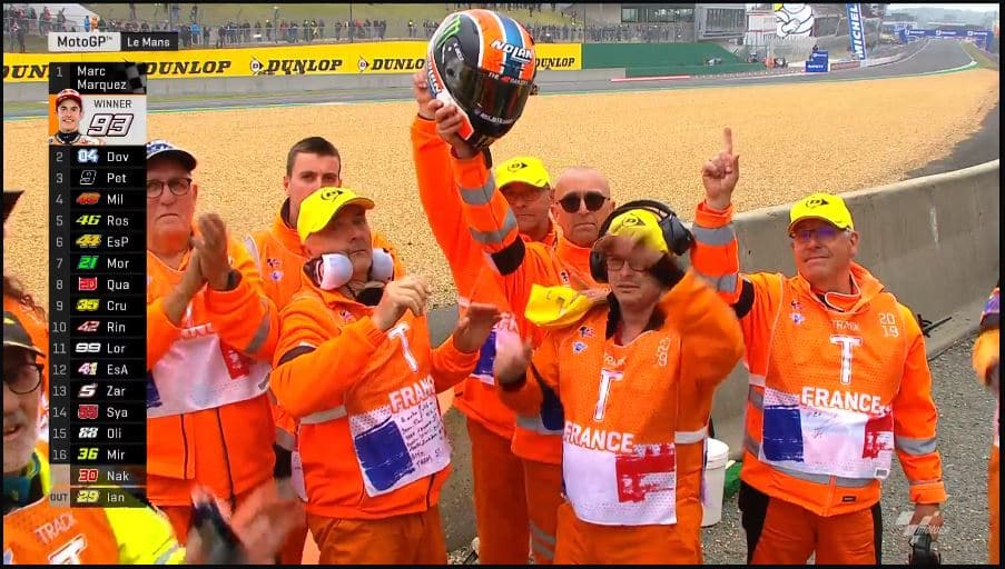 Álex Rins a été l’auteur d’un beau geste à la fin de la course. Dès que la manche du Mans a été terminée, le pilote Suzuki a laissé son casque aux commissaires de piste, s’arrêtant juste dans la zone où l’un d’entre eux a eu une attaque mortelle vendredi ( voir ici ). Le casque sera livré à la famille du commissaire décédé. Une façon de rendre hommage à toutes ces personnes qui, travaillant toujours dans les coulisses, constituent pourtant un élément fondamental d’un sport à risques.