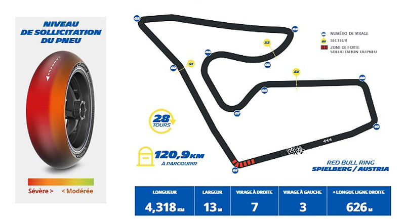 Avant ce double rendez-vous autrichien, Piero Taramasso, Manager Deux-roues de Michelin Motorsport, a déclaré : « Après le break estival, ce sera une reprise difficile à cause de ce tracé si particulier du Red Bull Ring. Les trois courtes lignes droites de la première moitié du circuit maintiennent des vitesses très élevées avant une série de courbes rapides en descente qui complètent le tour. »