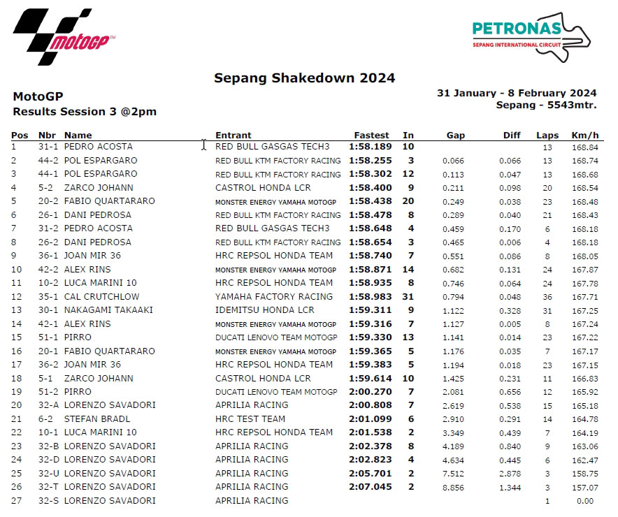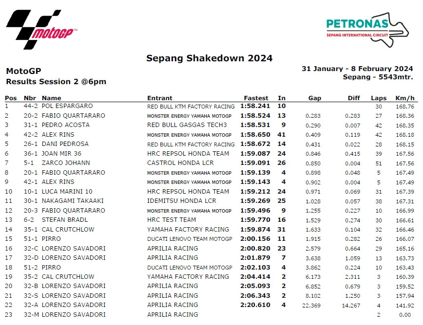 Le rookie a poursuivi ses efforts pour une dernière journée avant d’être rejoint par le reste de la catégorie la semaine prochaine, et a roulé à un rythme décent tout en continuant à faire baisser ses temps, cette fois-ci avec 1’58.189. Une petite chute mettait fin à la séance du matin, avant que celle de l’après-midi ne soit à nouveau perturbée par une forte pluie. Après cela, Acosta a eu ses premières sensations sur une piste mouillée avec la MotoGP™. Il a clôturé la dernière journée du Sepang Shakedown en tête des chronos, avec 0,066 seconde d’avance sur Pol Espargaro.