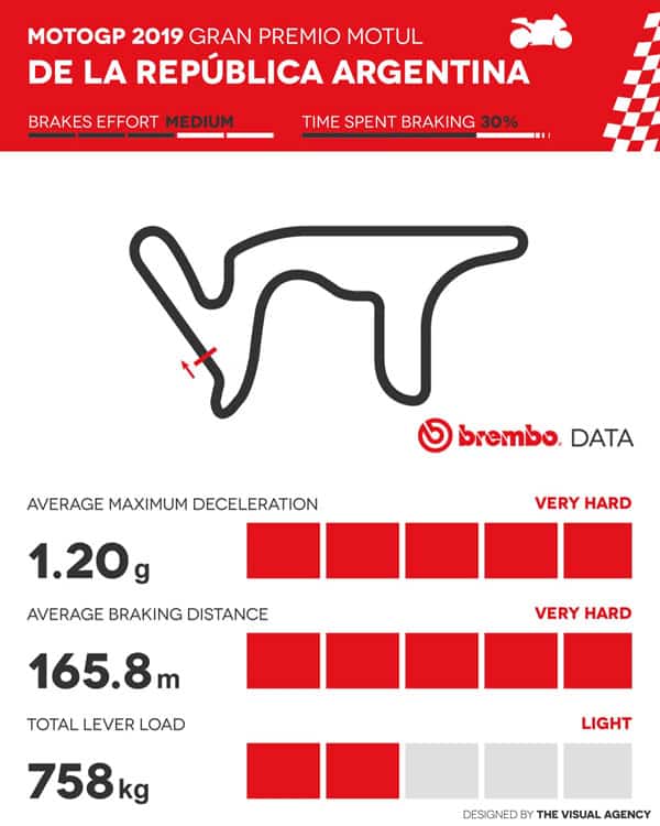 A chaque tour, les pilotes freinent pendant environ 30 secondes, le même temps passé à freiner à Jerez, Mugello et Assen. Le temps total de freinage pendant tout le GP d’Argentine est de 12,5 minutes, soit 30% de la durée totale de la course.