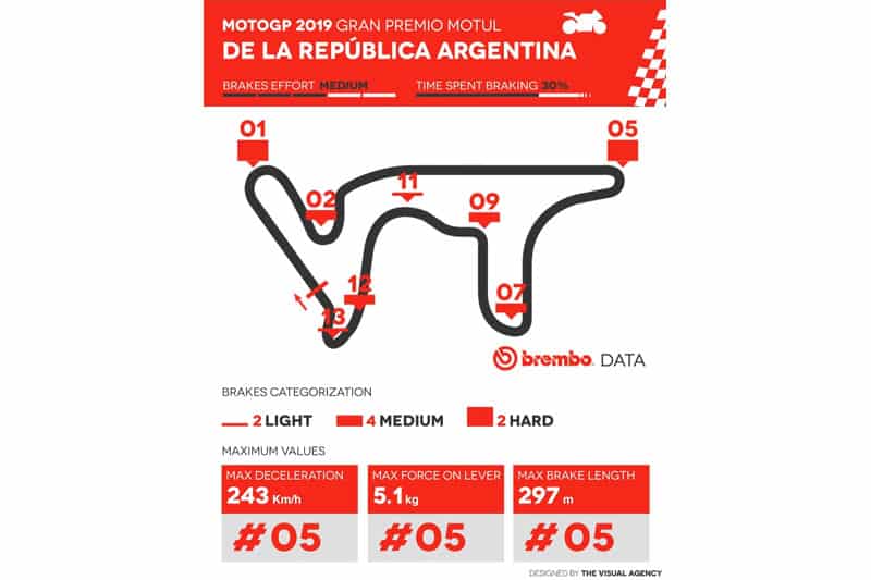 A chaque tour, les pilotes freinent pendant environ 30 secondes, le même temps passé à freiner à Jerez, Mugello et Assen. Le temps total de freinage pendant tout le GP d’Argentine est de 12,5 minutes, soit 30% de la durée totale de la course.