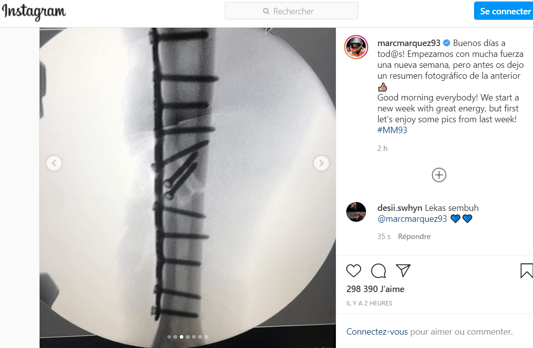Ce week-end, Marc Marquez a force l’admiration de ses contemporains en se présentant à Jerez pour y disputer le Grand Prix d’Andalousie, trois jours seulement après s’être fait opérer de son humérus droit fracturé. Une audace qui a bluffé les médecins qui ont été ensuite subjugués par la capacité du pilote à faire une série de pompes, malgré son état. Quel ; était-il exactement ? Voici les radios qui le révèlent. Âme sensible s’abstenir…