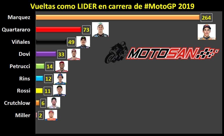 Petrucci a mené 14 tours, tandis qu’Álex Rins (Suzuki) l’a fait 12 fois. Le premier pilote sur la liste qui a mené sans gagner une course, est Valentino Rossi , avec 11 unités. Crutchlow avec 6 tours, et Miller avec 2, clôturent la liste des pilotes qui ont mené une course en cette année 2019. Aucun autre pilote n’a été en tête.