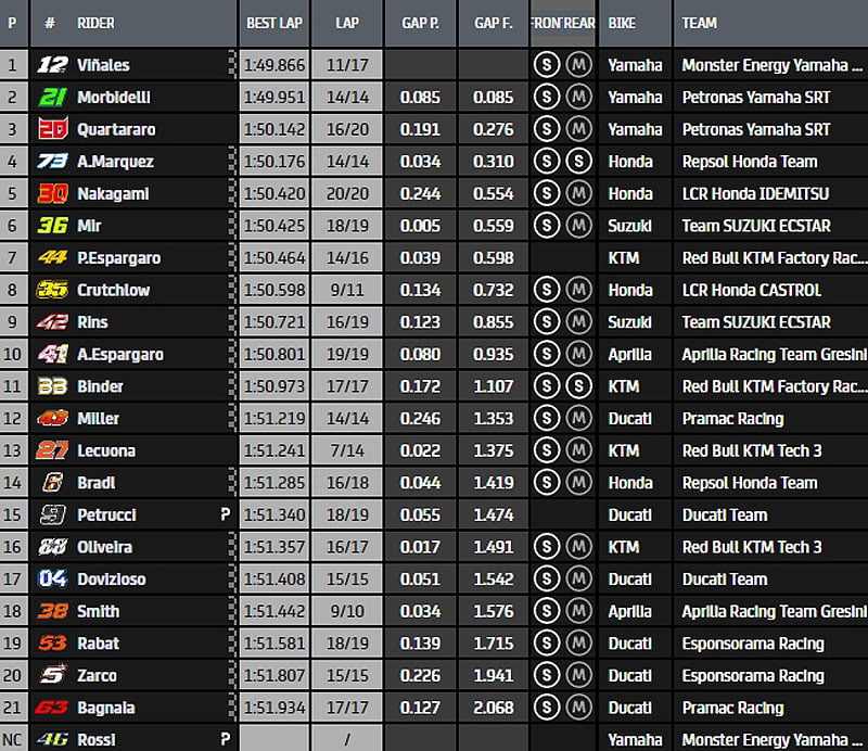 Le top 10 est alors constitué de Franco Morbidelli, Fabio Quartararo, Pol Espargaró, Maverick Viñales, Iker Lecuona, Takaaki Nakagami, Álex Márquez, Brad Binder, Stefan Bradl et Álex Rins.