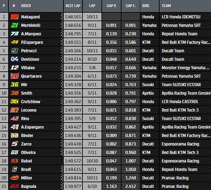 Franco Morbidelli n’entend pas lâcher le commandement aussi facilement et réalise 1’48.656 alors qu’il reste deux minutes dans la séance, mais Takaaki Nakagami s’affirme décidément comme un prétendant à la victoire : 1’48.565.