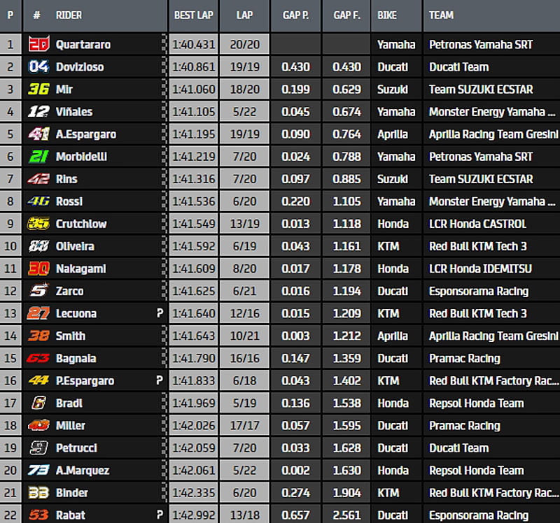 À la fin du premier run, El Diablo précède d’un dixième Maverick Viñales, Franco Morbidelli, Álex Rins, Joan Mir, Valentino Rossi, Miguel Oliveira, Takaaki Nakagami, Johann Zarco, Cal Crutchlow, Pol Espargaró, Stefan Bradl, Iker Lecuona, Aleix Espargaró, Danilo Petrucci, Álex Márquez, Bradley Smith, Jack Miller, Brad Binder, Andrea Dovizioso, Francesco Bagnaia et Tito Rabat.