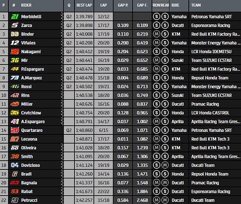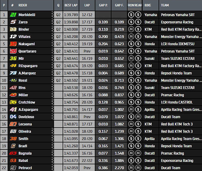 Dans le dernier tour, Maverick Viñales améliore et se place deuxième tandis que Johann Zarco et Franco Morbidelli sont encore en mesure de pouvoir s’emparer de la première position. Au final, l’Italien précède le Français en 1’39.789 !