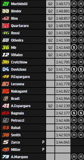 En attendant celles-ci, Fabio Quartararo, Andrea Dovizioso, Joan Mir, Maverick Viñales, Aleix Espargaró, Franco Morbidelli, Álex Rins, Valentino Rossi, Cal Crutchlow et Miguel Oliveira sont pour le moment qualifiés directement pour la Q2.