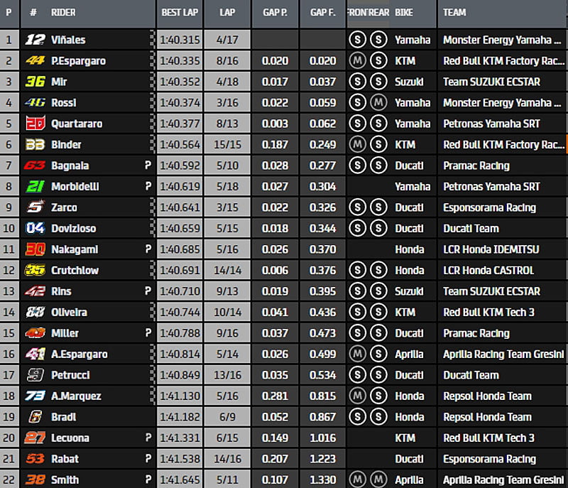 Le Docteur paraît décidément très en forme et reprend la tête au deuxième tour lancé en 1’40.374 devant Fabio Quartararo et Johann ZarcoMaverick Viñales et Joan Mir surpassent toutefois le champion italien dans leur troisième tour lancé mais les trois hommes se tiennent en 6 centièmes.
