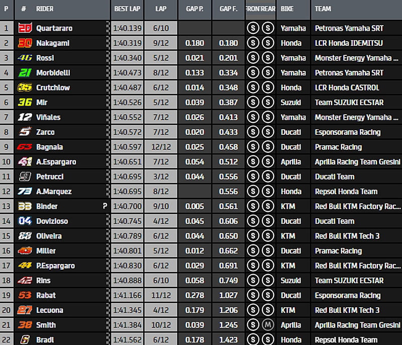À la mi-séance, la hiérarchie est composée de Fabio Quartararo, Valentino Rossi, Joan Mir, Danilo Petrucci, Francesco Bagnaia, Aleix Espargaró, Cal Crutchlow, Andrea Dovizioso, Franco Morbidelli, Miguel Oliveira, Johann Zarco et Maverick Viñales.