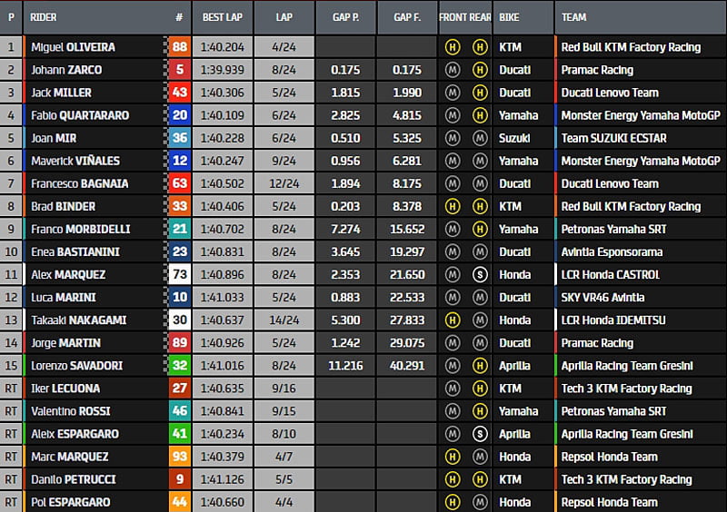 Encore 21 tours et le top10 est le suivant: Oliveira, Miller, A.Espargaro, Mir, Quartararo, Marc Marquez, Zarco, Vinales, Binder et Bagnaia.
