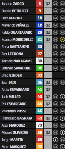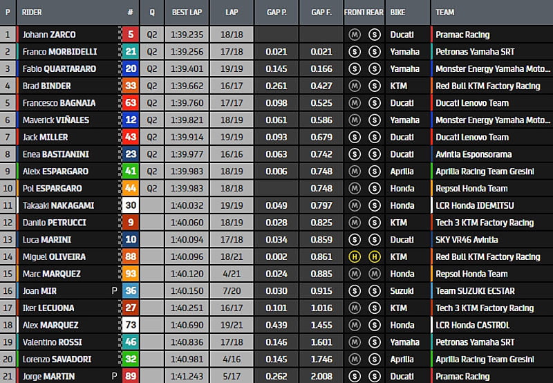 Après cette première salve, le pilote Petronas précède de 97/1000 Fabio Quartararo, puis Marc Márquez, Maverick Vinales, Pol Espargaro, Joan Mir, Johann Zarco, Miguel Oliveira, Aleix Espargaro et Iker Lecuona, tous pré-qualifiés pour la Q2.