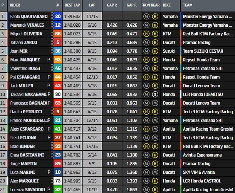 Un peu avant la mi-séance, le Français précède Maverick Vinales de 3 dixièmes, puis Miguel Oliveira, Johann Zarco, Marc Márquez, Valentino Rossi, Jack Miller, Takaaki Nakagami, Francesco Bagnaia, Pol Espargaro, Danilo Petrucci, Iker Lecuona, Enea Bastianini, Brad Binder, Franco Morbidelli, Jorge Martin, Joan Mir, Alex Márquez, Aleix Espargaro, Luca Marini et Lorenzo Savadori.