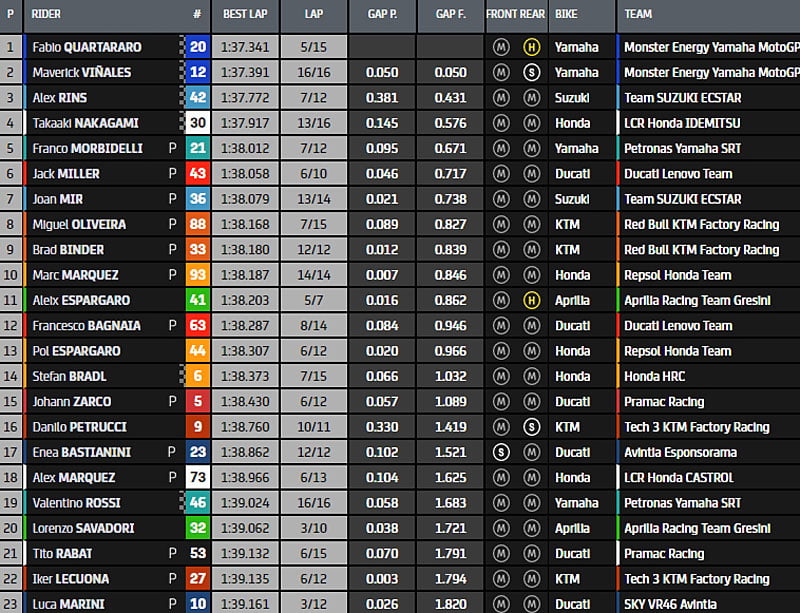 À la mi-séance, Fabio Quartararo précède de 4/10 Alex Rins, Maverick Vinales, Franco Morbidelli, Joan Mir, Miguel Oliveira, Aleix Espargaro, Takaaki Nakagami, Brad Binder, Pol Espargaro, Stefan Bradl, Marc Márquez, Johann Zarco, Francesco Bagnaia, Danilo Petrucci, Alex Márquez, Lorenzo Savadori, Tito Rabat, Iker Lecuona, Luca Marini, Valentino Rossi, Enea Bastianini et Jack Miller qui n’a toujours pas inscrit de chrono.