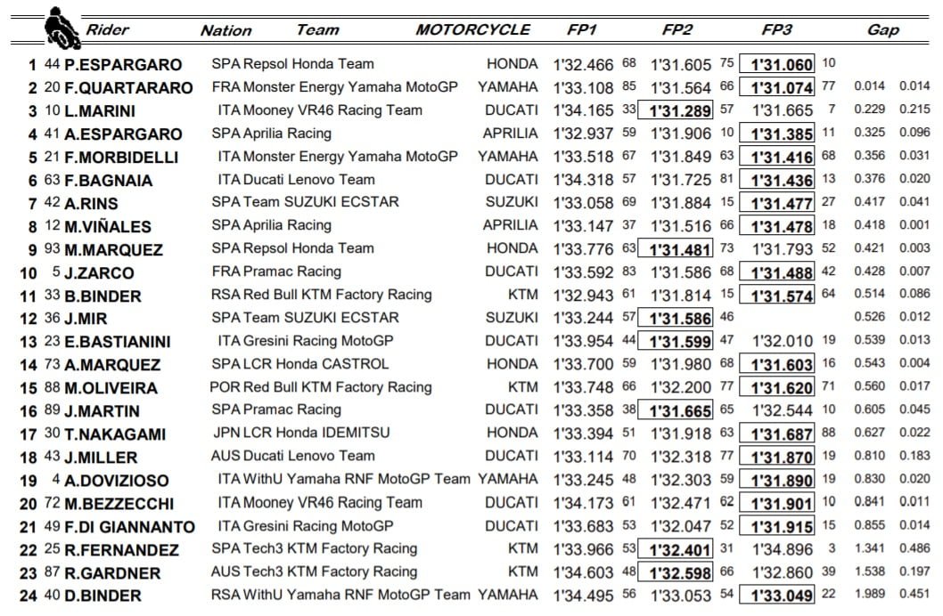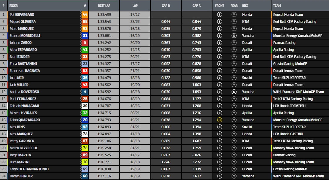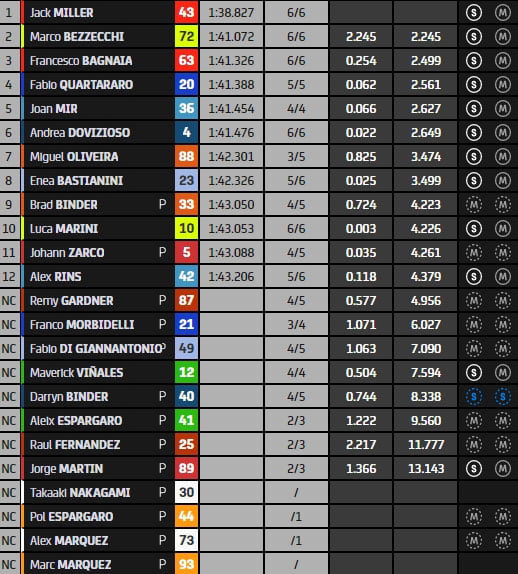 Marc Márquez revient à la charge en 1’34.987, précédant Johann Zarco, Pol Espargaro, Franco Morbidelli, Maverick Vinales, Brad Binder, Miguel Oliveira, Fabio Quartararo, Joan Mir, Alex Márquez, Takaaki Nakagami, Luca Marini, Aleix Espargaro, Marco Bezzecchi, Remy Gardner, Francesco Bagnaia, Raul Fernandez, Jack Miller, Alex Rins, Fabio Di Giannantonio, Darryn Binder, Andrea Dovizioso, Enea Bastianini et Jorge Martin avant le rush final.