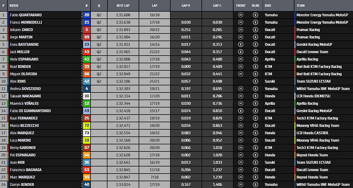 Ce matin, sur une piste encore très loin d’être propre, comme l’ont montré les Moto3 en fin de séance, Pol Espargaro, Miguel Oliveira, Marc Márquez, Franco Morbidelli, Johann Zarco, Aleix Espargaro, Brad Binder, Enea Bastianini, Francesco Bagnaia et Joan Mir ont fait un premier pas vers le passage direct en Q2, les trois premiers en moins d’un dixième de seconde, alors que Fabio Quartararo a dû se contenter du 16e temps…