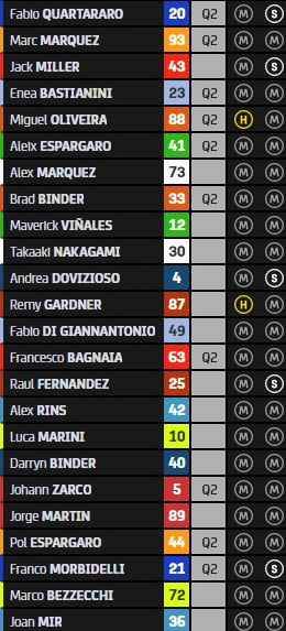 À l’entame du dernier quart d’heure, le top 10 est maintenant constitué de Miguel Oliveira, Francesco Bagnaia, Marc Márquez, Fabio Quartararo, Enea Bastianini, Johann Zarco, Alex Rins, Pol Espargaro, Franco Morbidelli et Jorge Martin, le tout en 4 dixièmes.