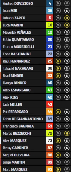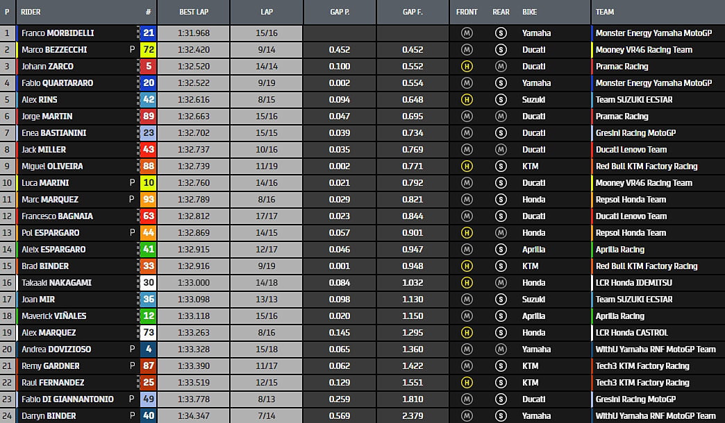 La hiérarchie est alors composée de Marco Bezzecchi, Fabio Quartararo, Álex Rins, Marc Márquez, Jorge Martin, Miguel Oliveira, Francesco Bagnaia, Brad Binder, Aleix Espargaró, Pol Espargaró, Enea Bastianini, Álex Márquez, Franco Morbidelli, Johann Zarco, Andrea Dovizioso, Remy Gardner, Luca Marini, Jack Miller, Raúl Fernández, Joan Mir, Fabio Di Giannantonio, Takaaki Nakagami, Maverick Viñales et Darryn Binder.