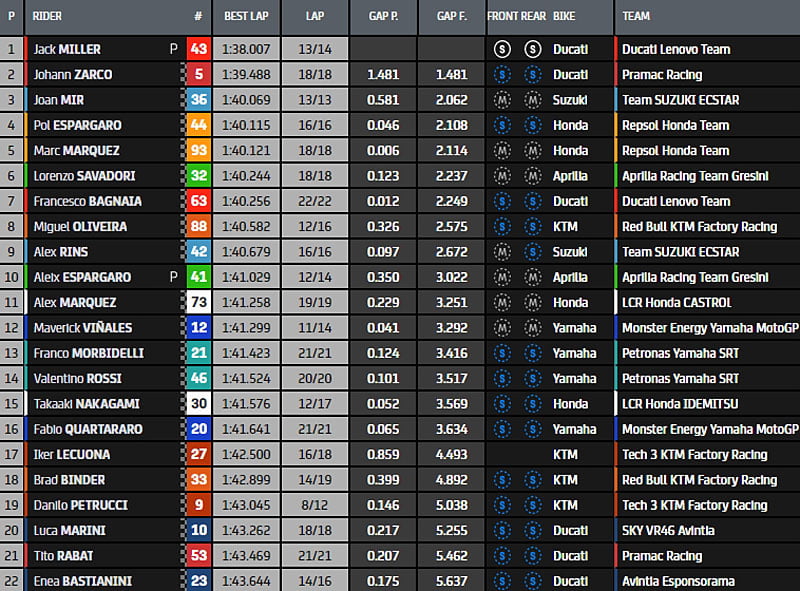 Au final, le top 10 est constitué de Jack Miller, Johann Zarco, Joan Mir, Pol Espargaro, Marc Márquez, Lorenzo Savadori, Francesco Bagnaia, Miguel Oliveira, Alex Rins et Aleix Espargaro: aucune Yamaha ne figure dans le top 10, contrairement aux deux Aprilia !