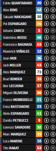 Pour le moment, la liste des pré-qualifiés est constituée de Jack Miller, Johann Zarco, Joan Mir, Pol Espargaro, Marc Márquez, Lorenzo Savadori, Francesco Bagnaia, Miguel Oliveira, Alex Rins et Aleix Espargaro: de façon aussi spectaculaire que surprenante, aucune Yamaha ne figure dans le top 10, contrairement aux deux Aprilia !