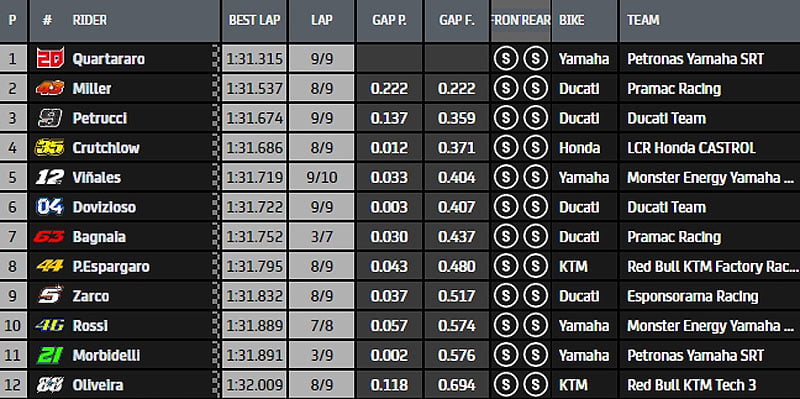 Aux Fabio Quartararo, Miguel Oliveira, Franco Morbidelli, Jack Miller, Cal Crutchlow, Johann Zarco, Valentino Rossi, Maverick Vinales, Pol Espargaro et Andrea Dovizioso, déjà qualifiés ce matin pour un passage direct en Q2, viennent de s’adjoindre Danilo Petrucci et Francesco Bagnaia qui se sont repêchés en Q1.