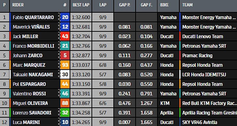 Il reste un seul tour quand la piste se libère… ce qui permet à Pol Espargaró de chuter mais surtout à Maverick Viñales de s’emparer du leadership avant de le céder à Fabio Quartararo en 1’32.600 !