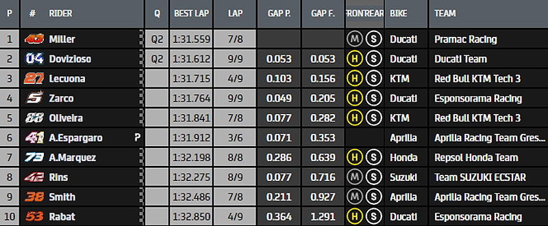 Aux Francesco Bagnaia, Maverick Viñales, Fabio Quartararo, Franco Morbidelli, Joan Mir, Brad Binder, Takaaki Nakagami, Valentino Rossi, Pol Espargaró et Danilo Petrucci, déjà pré-qualifiés pour la qualification finale, viennent de s’adjoindre Jack Miller et Andrea Dovizioso à l’issue de la Q1 de ce Grand Prix d’Emilie-Romagne.