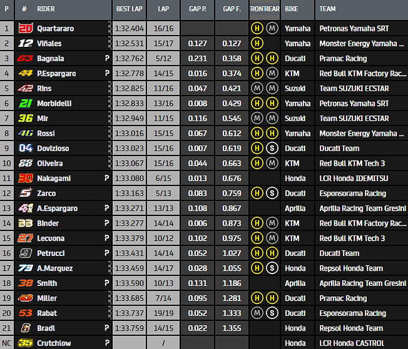 Pol Espargaró et Joan Mir font alors leur arrivée dans le top 5 pendant que Maverick Viñales remonte à la deuxième position.