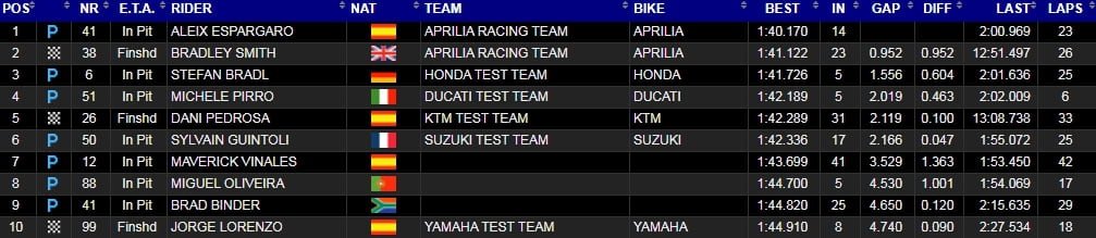 Aleix Espargaró, actuel recordman du tracé en 1’40.170, n’est pas en reste et bondit de la 14e à la 5e place avant de se positionner troisième provisoire.