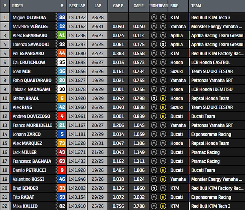 Le top 10 est alors constitué de Miguel Oliveira, Maverick Viñales, Jack Miller, Joan Mir, Pol Espargaró, Fabio Quartararo, Johann Zarco, Takaaki Nakagami, Álex Márquez et Franco Morbidelli.