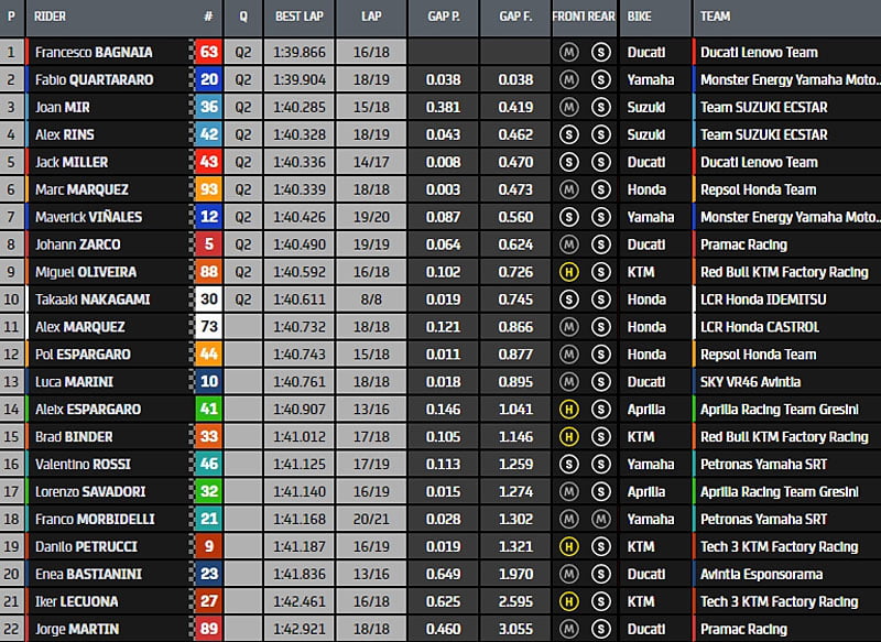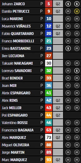 Pour le moment, Maverick Vinales, Alex Rins, Marc Márquez, Pol Espargaro, Johann Zarco, Francesco Bagnaia, Fabio Quartararo, Jack Miller, Alex Márquez et Danilo Petrucci sont pré-qualifiés pour la Q2.