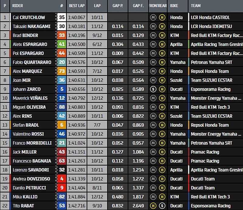 A la dernière minute, Takaaki Nakagami produit son effort et s’empare pendant quelques secondes du commandement, mais c’est bien Cal Crutchlow qui était dans son sillage qui en profite en s’imposant en 1’40.067 !