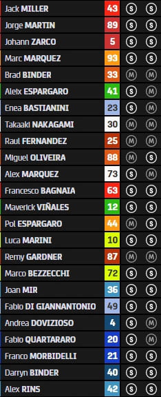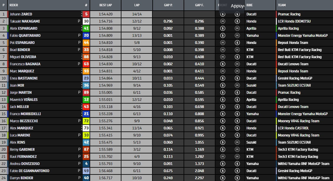 Hier, Álex Rins, Marc Márquez, Joan Mir, Jorge Martín, Franco Morbidelli, Jack Miller, Aleix Espargaró, Fabio Quartararo, Pol Espargaró et Francesco Bagnaia se sont donc provisoirement pré-qualifiés directement pour la Q2, tous dans la même demi-seconde.