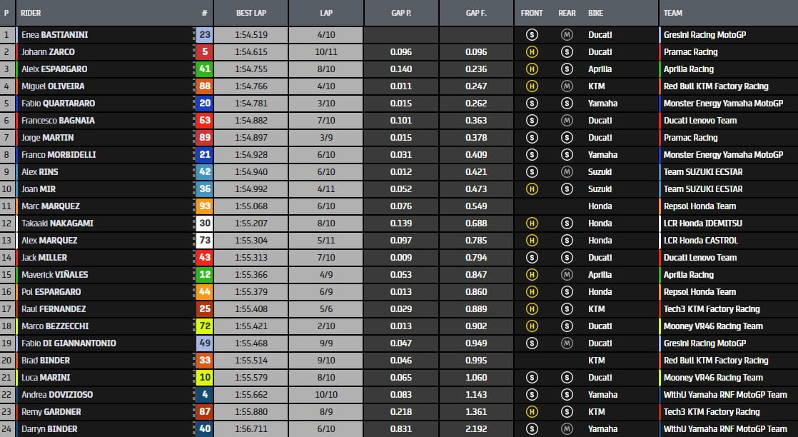 A la mi-séance, la hiérarchie est composée de Enea Bastianini, Miguel Oliveira, Fabio Quartararo, Jorge Martin, Franco Morbidelli, Alex Rins, Joan Mir, Johann Zarco, Francesco Bagnaia, Aleix Espargaro, Marc Márquez, Alex Márquez, Maverick Vinales, Pol Espargaro, Raul Fernandez, Marco Bezzecchi, Jack Miller, Takaaki Nakagami, Fabio Di Giannantonio, Brad Binder, Luca Marini, Andrea Dovizioso, et Darryn Binder.