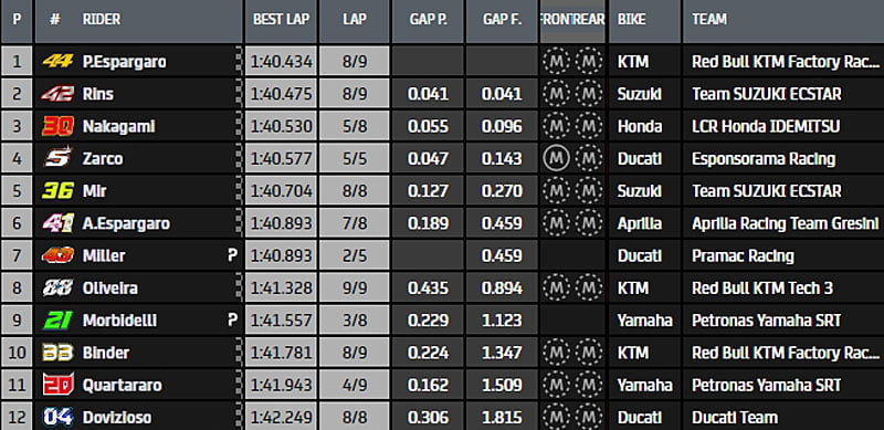 Il reste deux minutes quand Álex Rins améliore la référence en 1’40.525. À cet instant, Takaaki Nakagami chute sans gravité mais l’apparition des drapeaux jaunes oblige Johann Zarco à relâcher son effort alors qu’il allait sans doute réaliser le meilleur temps.