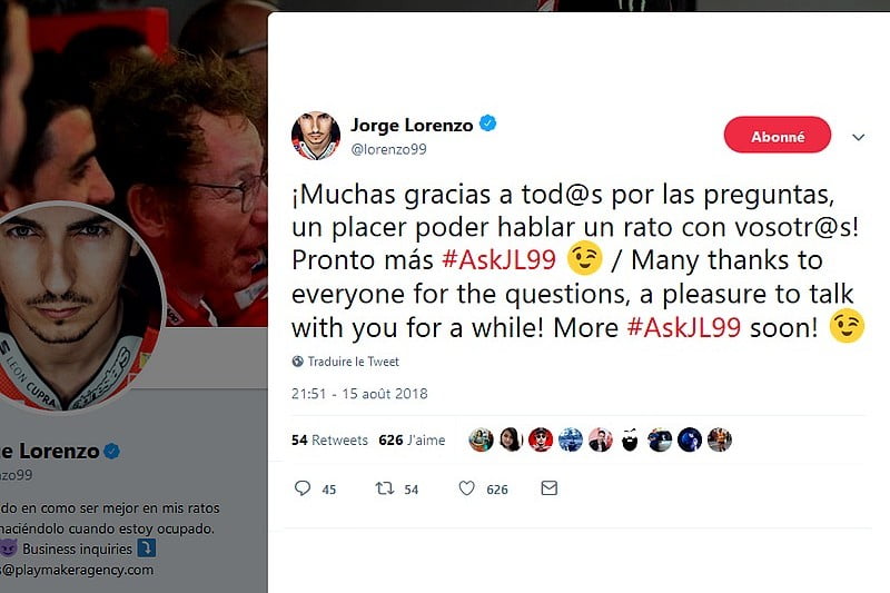 Jorge Lorenzo s’est amusé à répondre aux questions de dizaines de fans sur Twitter. Qu’il s’agisse de demandes concernant sa carrière ou sa vie personnelle, il a joué le jeu et a ainsi permis d’en apprendre plus sur lui. Voici donc, pèles mêles, une sélection de ses réponses.