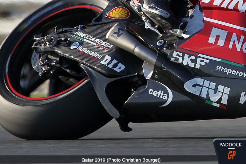 Il illustre son propos en pointant sur le domaine sensé être concerné par sa dernière innovation, argumentant que l’appendice aérodynamique apparu sous le bras oscillant des Ducati officielles est uniquement destiné à refroidir le pneu arrière : « Par exemple, une des choses que j’ai entendues, et cela m’a laissé perplexe, était qu’il n’était pas nécessaire de refroidir le pneu arrière au Qatar puisque le froid y régnait. La télévision, tout le monde a vu la fumée que la Suzuki laissait lors de l’accélération après le virage 11. Le Qatar est l’un des circuits les plus exigeants pour les pneus arrière et beaucoup ont eu des problèmes. Donc le fait que beaucoup ont dit que les nôtres étaient juste une excuse signifient probablement qu’ils ne comprenaient pas grand-chose ».