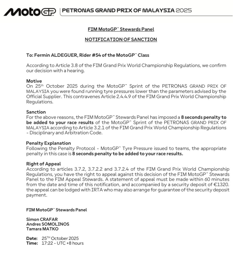 BREAKING: @Aldeguer54 loses his #TissotSprint podium after being handed an 8s penalty due to low tyre pressure ⚠️ #MalaysianGP 🇲🇾 pic.twitter.com/ukNSQyFOf2