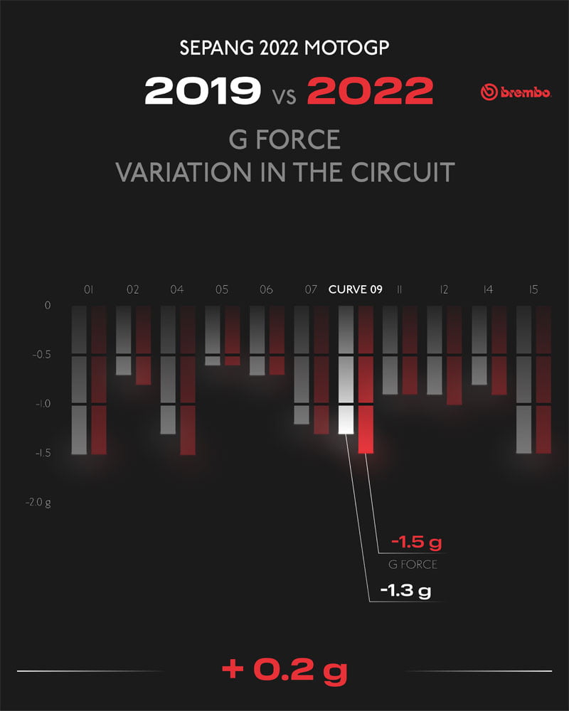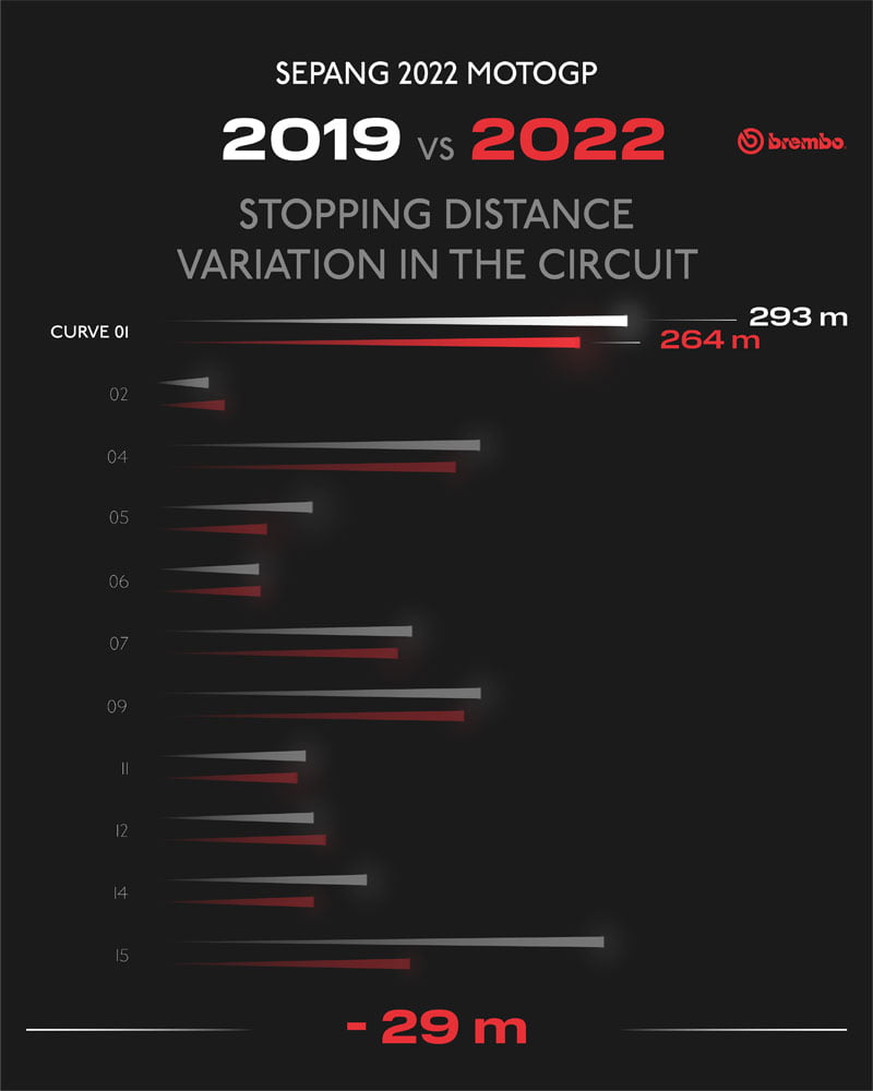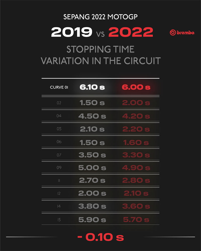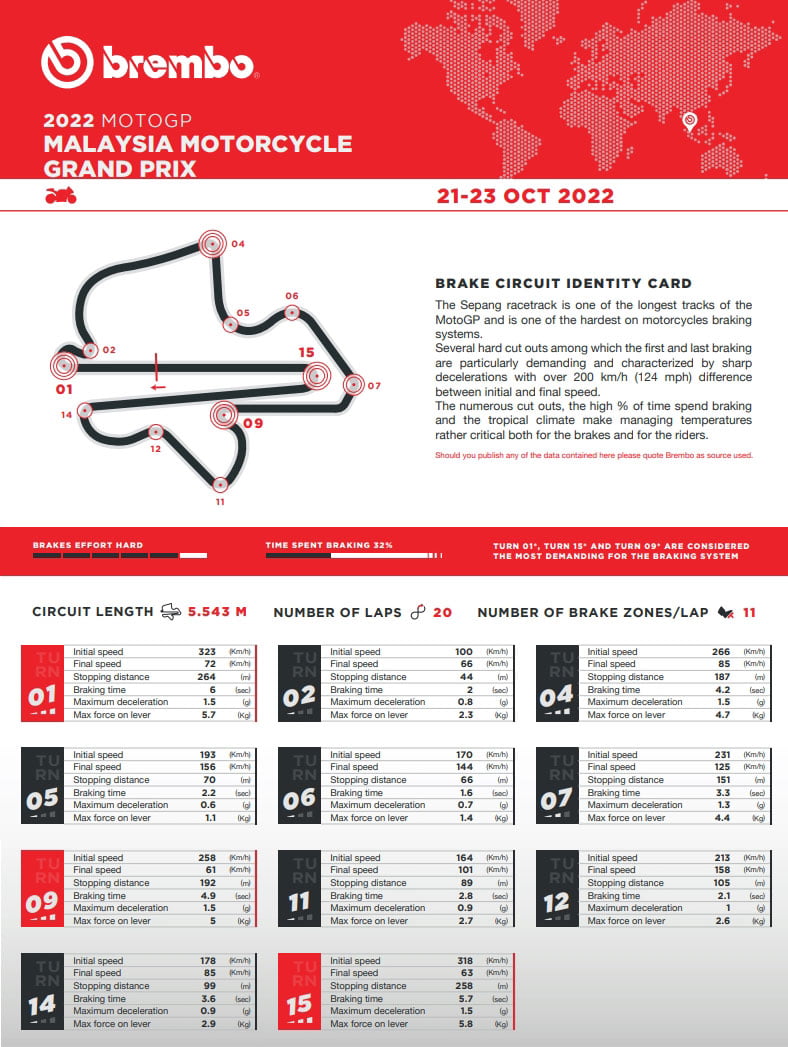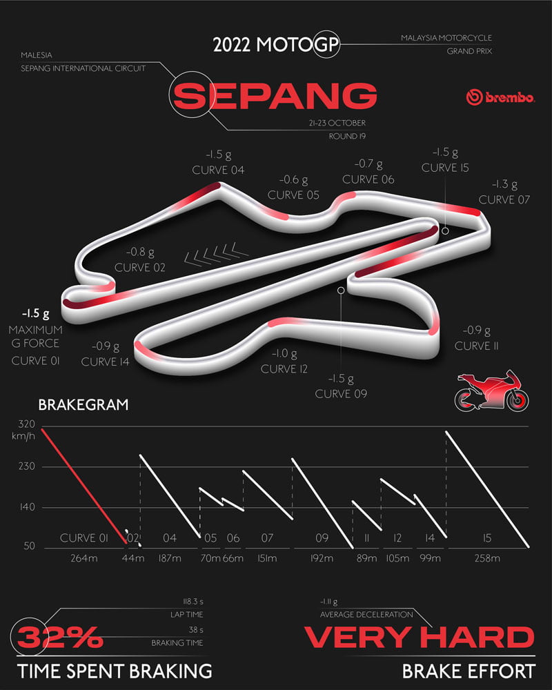 Les MotoGP utilisent leurs freins 11 fois par tour pour un total de 38 secondes, soit 32 % de l’ensemble du GP. Ces 38 secondes sont seulement moins que les 40 secondes à Losail, mais là-bas les freins sont utilisés 13 fois par tour. À Sepang, 4 moments de freinage durent au moins 4 secondes et quelques-uns plus de 5 secondes : 5,7 secondes sont nécessaires dans le dernier virage pour réduire la vitesse de 255 km/h en seulement 258 mètres.