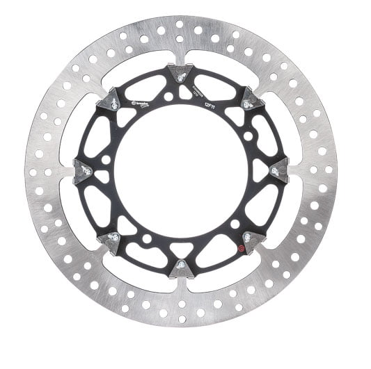 Les motos de route et les motos utilisées pour les journées de piste n’ont évidemment pas de disques en fibre de carbone. Cela ne signifie pas pour autant que l’expérience acquise en MotoGP n’a pas eu un effet positif sur la production en usine. Le disque T-Drive, avec sa bande de freinage en acier et son boîtier en aluminium usiné, en est une bonne illustration. Le système T-Drive tire son nom des huit goupilles en forme de T sur le disque qui, avec le même nombre de contours sur le boîtier, éliminent le besoin de goujons de fixation. Il en résulte un flottement à la fois axial et radial, ce qui augmente la résistance aux contraintes thermomécaniques et au couple de freinage transmis.