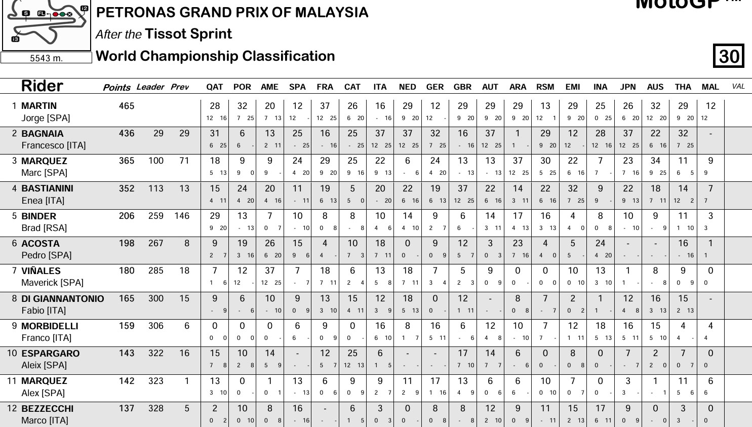 Il reste 62 points à potentiellement inscrire, dont 25 dès demain, autant dire que la pression est à son maximum, car Jorge Martin y possèdera sa première balle de match. Pour la remporter, il lui suffit d’inscrire 9 points de plus que son adversaire durant le GP…