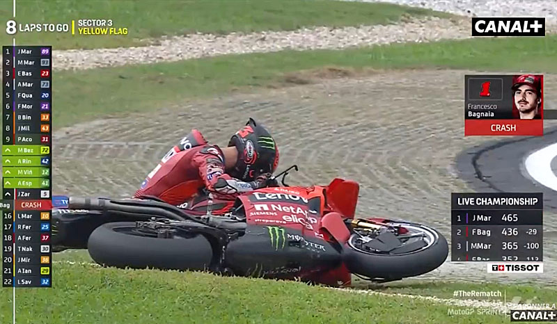 Si vous avez manqué l’excellent départ et la maîtrise du leader du championnat Jorge Martin (Prima Pramac Racing) qui prend tout de suite l’avantage sur le poleman Francesco Bagnaia (Ducati Lenovo Team), l’opportunisme de Marc Marquez (Gresini Racing MotoGP™) toujours très incisif dans les premières secondes, l’échappée de ces trois hommes puis l’erreur (sous tous les angles) du champion du monde en titre au 3e tour, ainsi que la bataille finale entre Brad Binder (Red Bull KTM Factory Racing) et Pedro Acosta (Red Bull GASGAS Tech3), la chaîne cryptée vous offre une petite séance de rattrapage en accéléré.