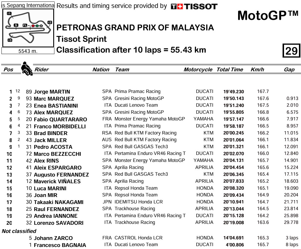 Dans un championnat qui commence nettement à pencher du côté espagnol, ce sprint a pour la première fois changé la donne en tête, le leader Jorge Martin passant de 17 à 29 points devant le double champion du monde en titre Francesco Bagnaia, alors que pour la 3e marche du podium final, conservée par Marc Marquez, l’écart augmente de 11 à 13 points sur Enea Bastianini (Ducati Lenovo Team).