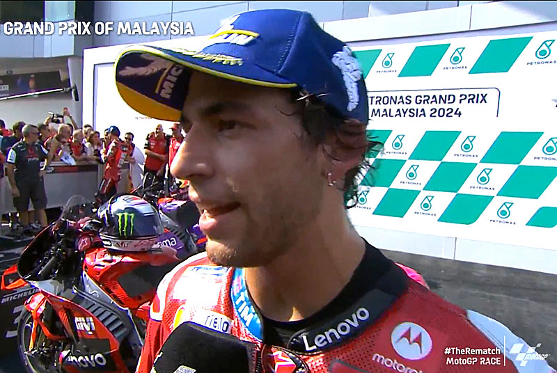 A peine descendu de sa Ducati GP24 officielle après avoir terminé 3e du Grand Prix de Malaisie MotoGP 2024 à Sepang, Enea Bastianini s’est confié devant les caméras du site officiel MotoGP.com avec des sentiments partagés…