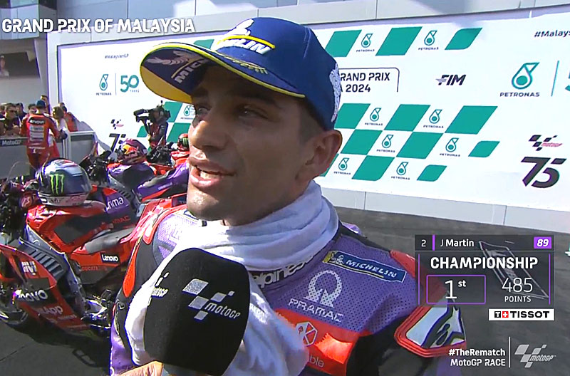 A peine descendu de sa Ducati GP24 du team Pramac après avoir terminé 2e du Grand Prix de Malaisie MotoGP 2024 à Sepang, Jorge Martin s’est confié devant les caméras du site officiel MotoGP.com avec la satisfaction d’avoir tout fait, sauf l’épicier…