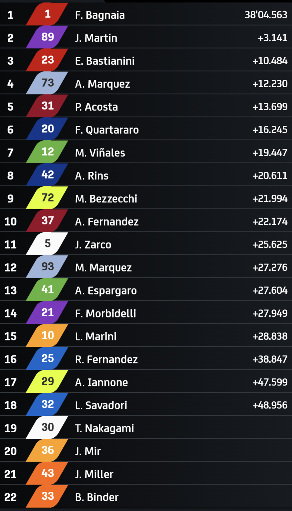 A 12 tours du finish, Bagnaia a une avance d’1.257s..sur Martin. Bastianini, AMarquez, Acosta, Quartararo, Vinales, Rins, Zarco et Bezzecchi ferment la marche du top10