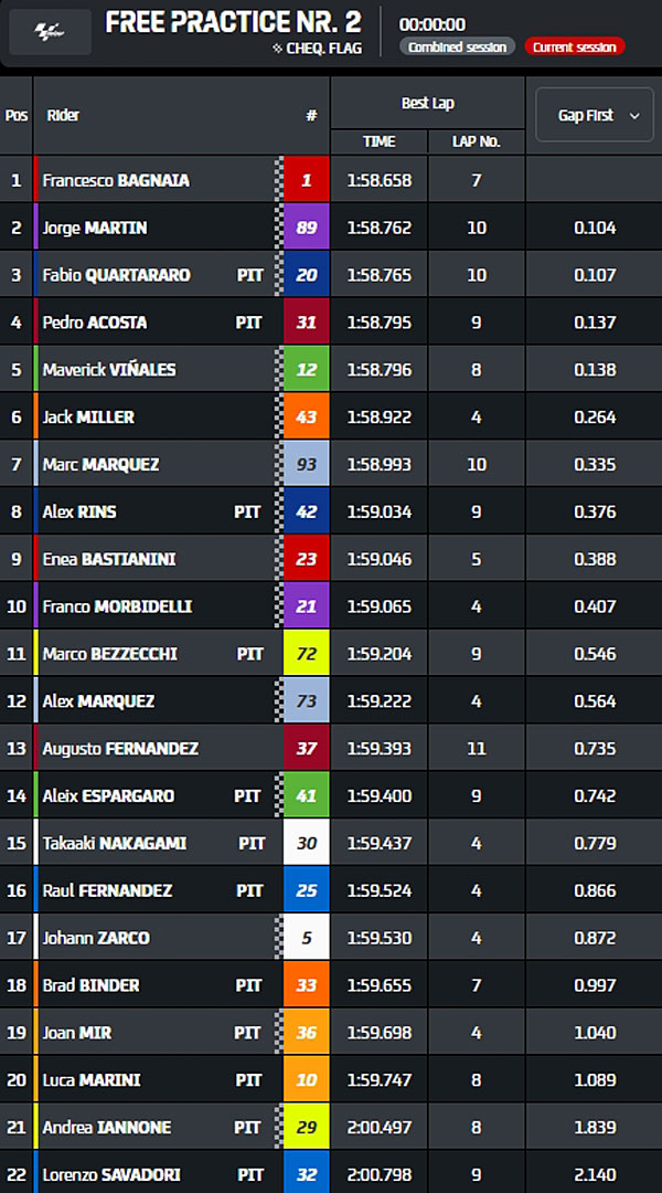 Dans une séance où l’on n’avait pas vu les Yamaha en aussi bonne forme depuis longtemps, Francesco Bagnaia, Jorge Martin, Enea Bastianini, Maverick Vinales, Alex Márquez, Fabio Quartararo, Franco Morbidelli, Alex Rins, Jack Miller et Marc Márquez ont gagné leur accès direct à la Q2 lors de la Practice, laissant ainsi Pedro Acosta, Marco Bezzecchi, Johann Zarco et Brad Binder s’expliquer entre eux pour tenter de se repêcher lors de la Q1.