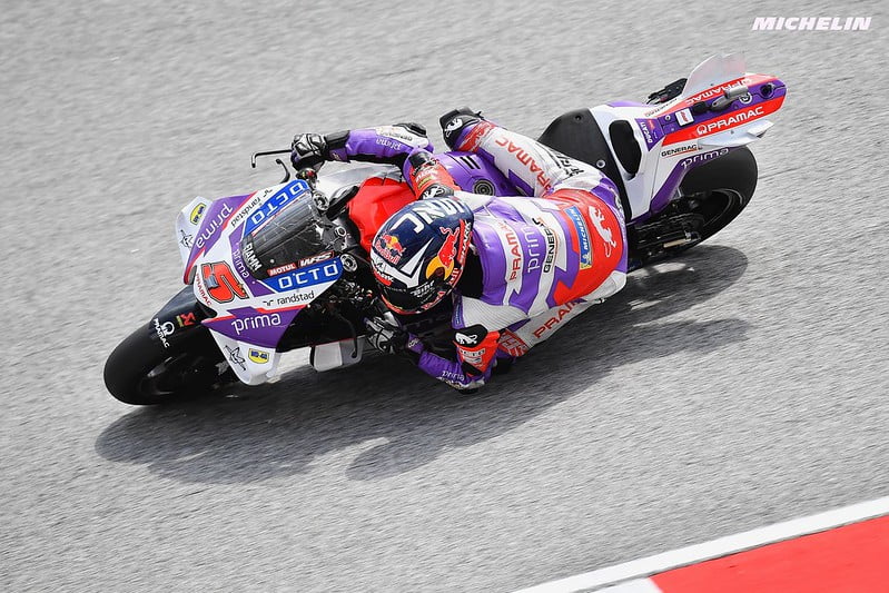 « Pecco et Fabio, possible ! Aleix moins, mais pour moi c’est moins un prétendant au titre que Pecco et Fabio. Et lui il insiste : Il a déjà fait deux chutes, d’entrée en FP1 et ensuite là. Des chutes de l’avant. Il tente, il est à la limite, mais ça ne passe pas, mais je ne le vois pas moins à l’aise que d’habitude. Les autres, oui, peut-être, là je vois un peu : Tu as beaucoup plus de caméras sur toi tout le weekend, Du coup ça doit y jouer. »