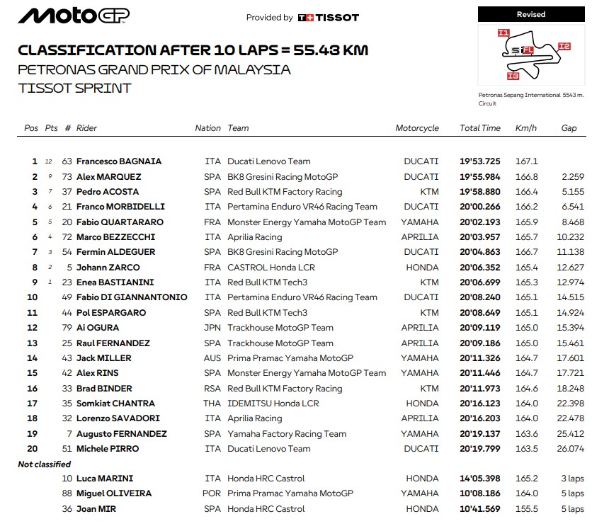 Résultat du Sprint au Grand Prix de Malaisie MotoGP 2025 :