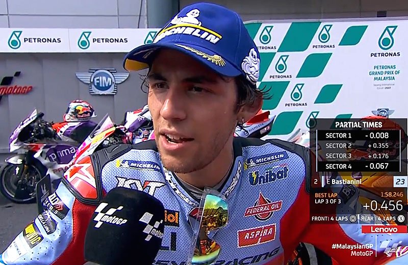 A peine descendu de sa Ducati GP22 satellite du team Gresini Racing après avoir obtenu 2e position sur la grille de départ du Grand Prix de Malaisie MotoGP sur le circuit de Sepang, Enea Bastianini s’est confié devant les caméras du site officiel MotoGP.com avec la satisfaction d’avoir progressé par rapport à vendredi…